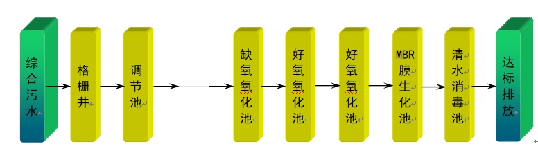 根據(jù)污水水質(zhì)及有關(guān)實(shí)踐經(jīng)驗(yàn),本著投資省、運(yùn)行費(fèi)用低、操作管理方便的原則,向建設(shè)一個(gè)高效、緊湊、省地、節(jié)能的污水處理廠靠攏,優(yōu)先采用適合我國國情的最佳使用技術(shù)的原則,根據(jù)目前國內(nèi)此類污水處理技術(shù)的現(xiàn)狀,在綜合考察各種廢水治理技術(shù)的基礎(chǔ)上,結(jié)合本項(xiàng)目的實(shí)際,擬采用“調(diào)節(jié)池+缺氧生物接觸氧化池+好氧生物接觸氧化池+MBR膜池+接觸消毒池”工藝進(jìn)行污水處理。